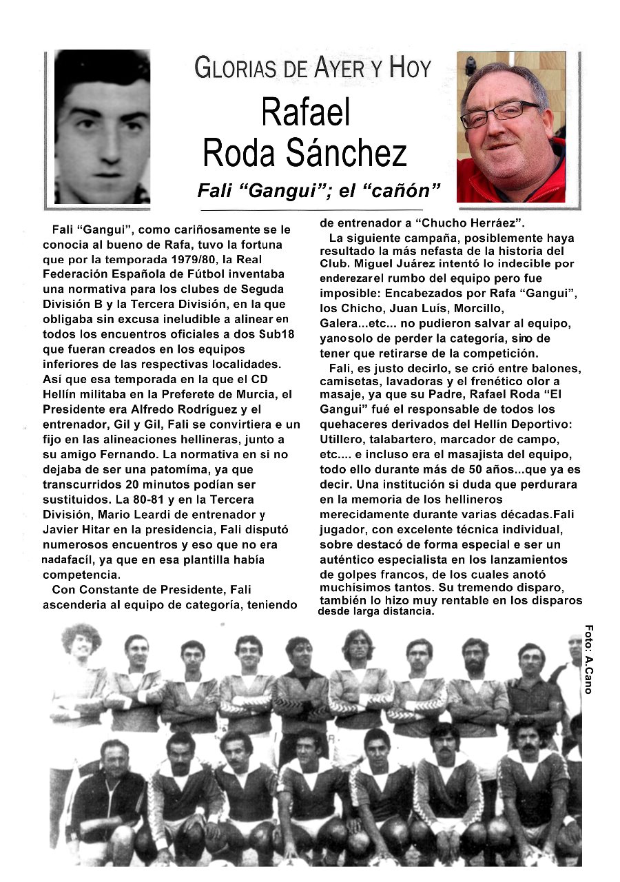 Rafael Jesús Gómez Abellán, “el gordo”, así era como cariñosamente se la llamo, socialmente y deportivamente. No fue un futbolista dotado de muy buenas cualidades técnicas, esa no era su faceta más acentuada, pero la suplía con creces, con su lucha, su profesionalidad, su valentía y el amor por los colores de su equipo. Todo ello le valió, para tener un aprecio especial, ya no solo por los compañeros de equipo, si no por todos los directivos que disfrutó y sobre todo por la afición, que siempre lo considero y tuvo en gran estima.